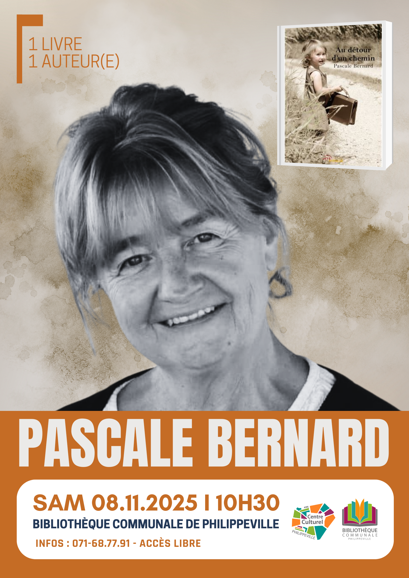 Pascale Bernard est une autrice belge vivant à Sivry. Après une rencontre marquante, elle décide de porter à l’écrit l’histoire qui lui est racontée. C’est ainsi que parait, en 2012, son premier roman : « Au détour d’un chemin ». Depuis, elle n’a cessé d’écrire et de romancer les récits de personnes blessées par la vie qui souhaitaient partager leurs histoires.